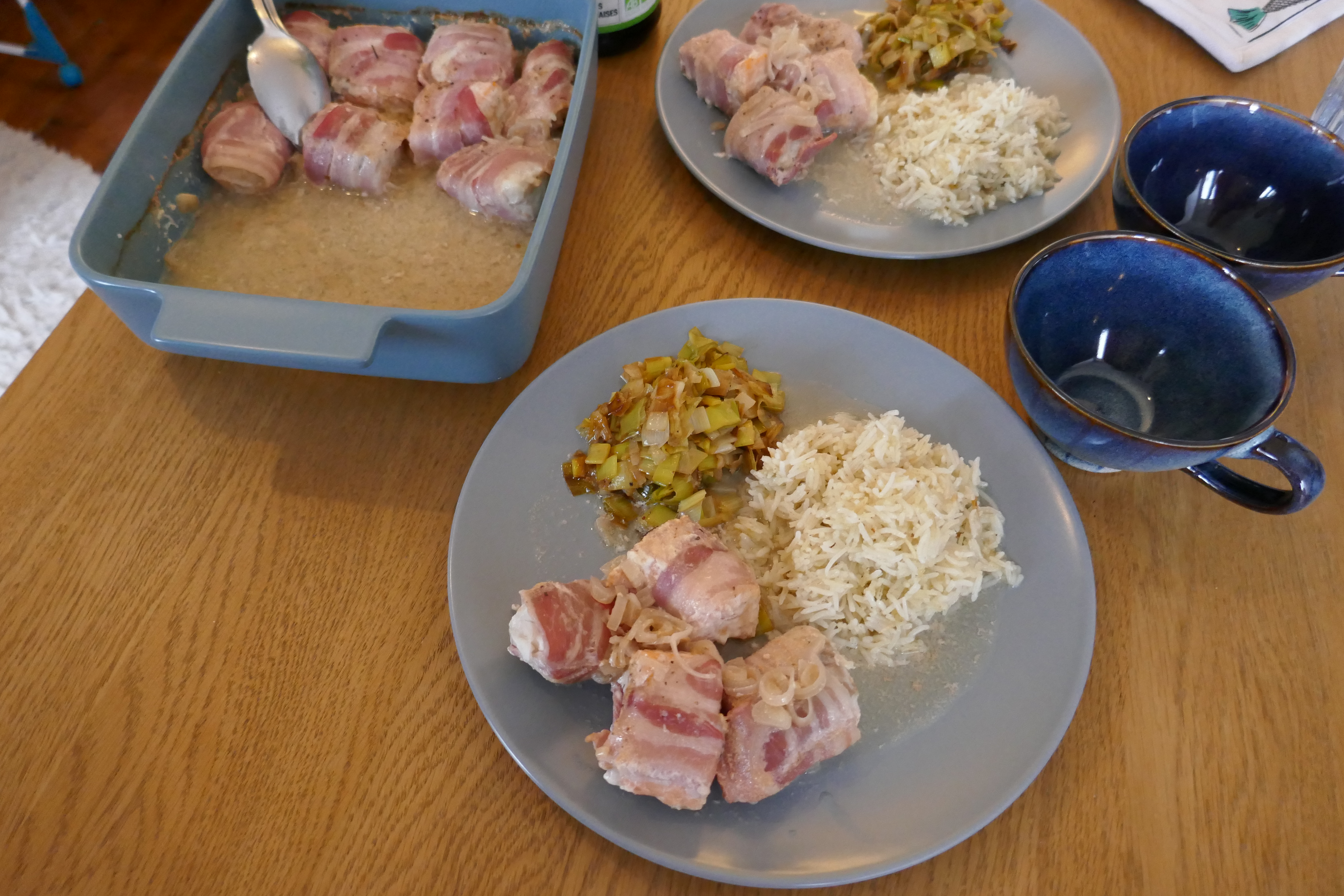 - Déposer les poissons entourés de lard dans le plat, par dessus les échalotes. Verser les 200mL de cidre restant par dessus, saler et poivrer. Les morceaux de poisson ne doivent pas se chevaucher pour être immergés dans le cidre au maximum afin de ne pas sécher pendant la cuisson.