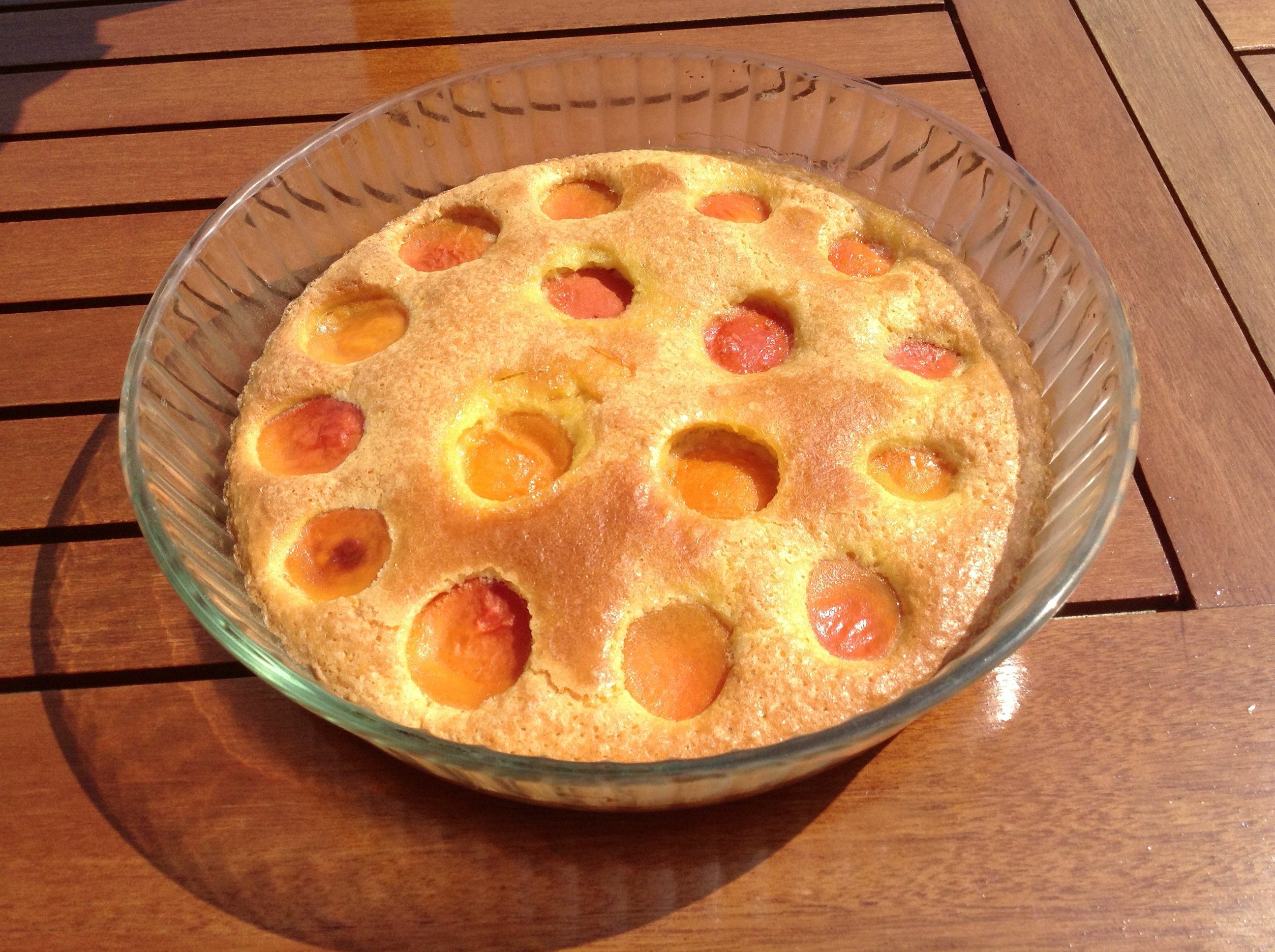 - Verser la pâte dans un moule beurré au préalable et poser les abricots coupés en deux par dessus.
