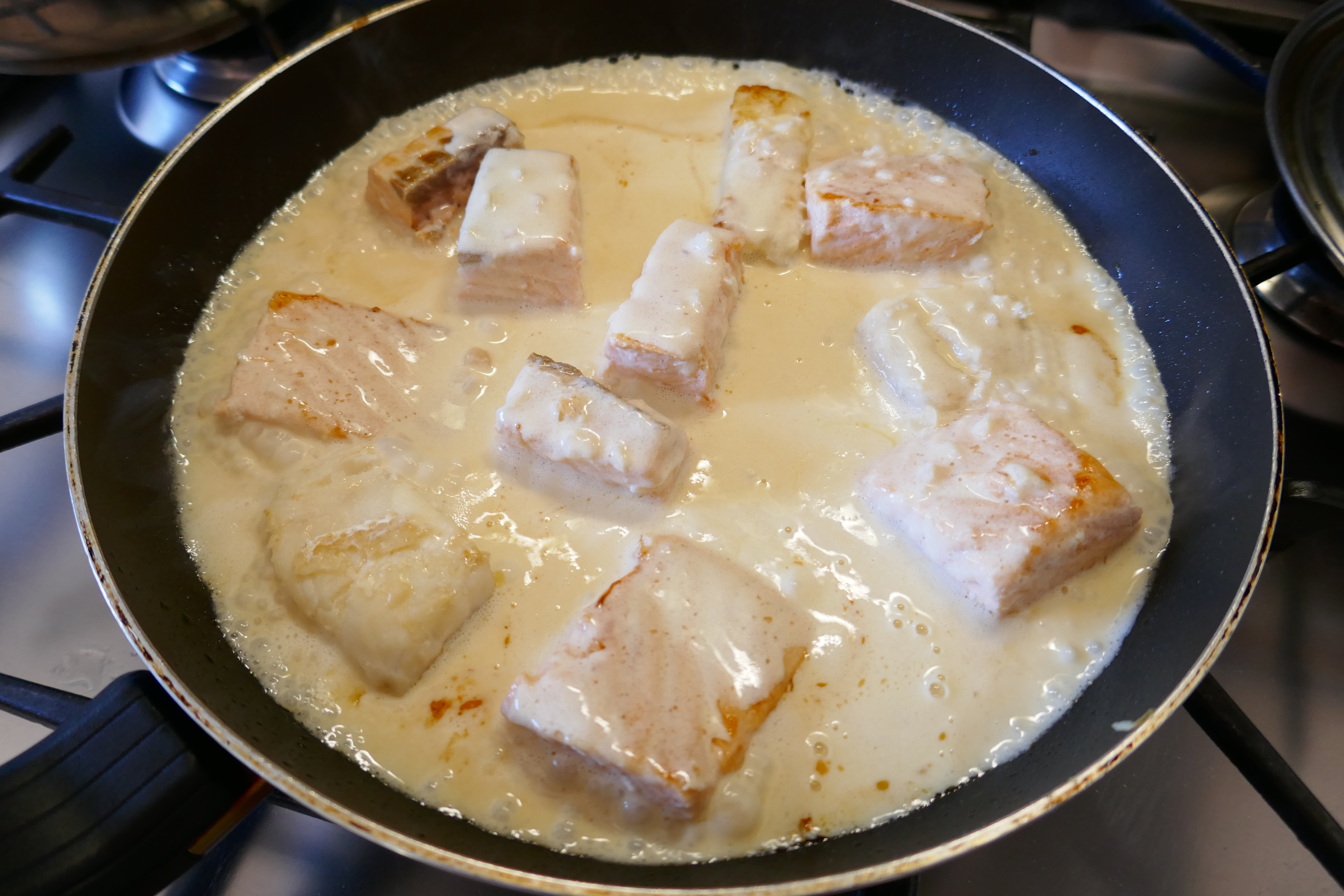 - Dans une poêle, faire cuire le poisson en morceaux.