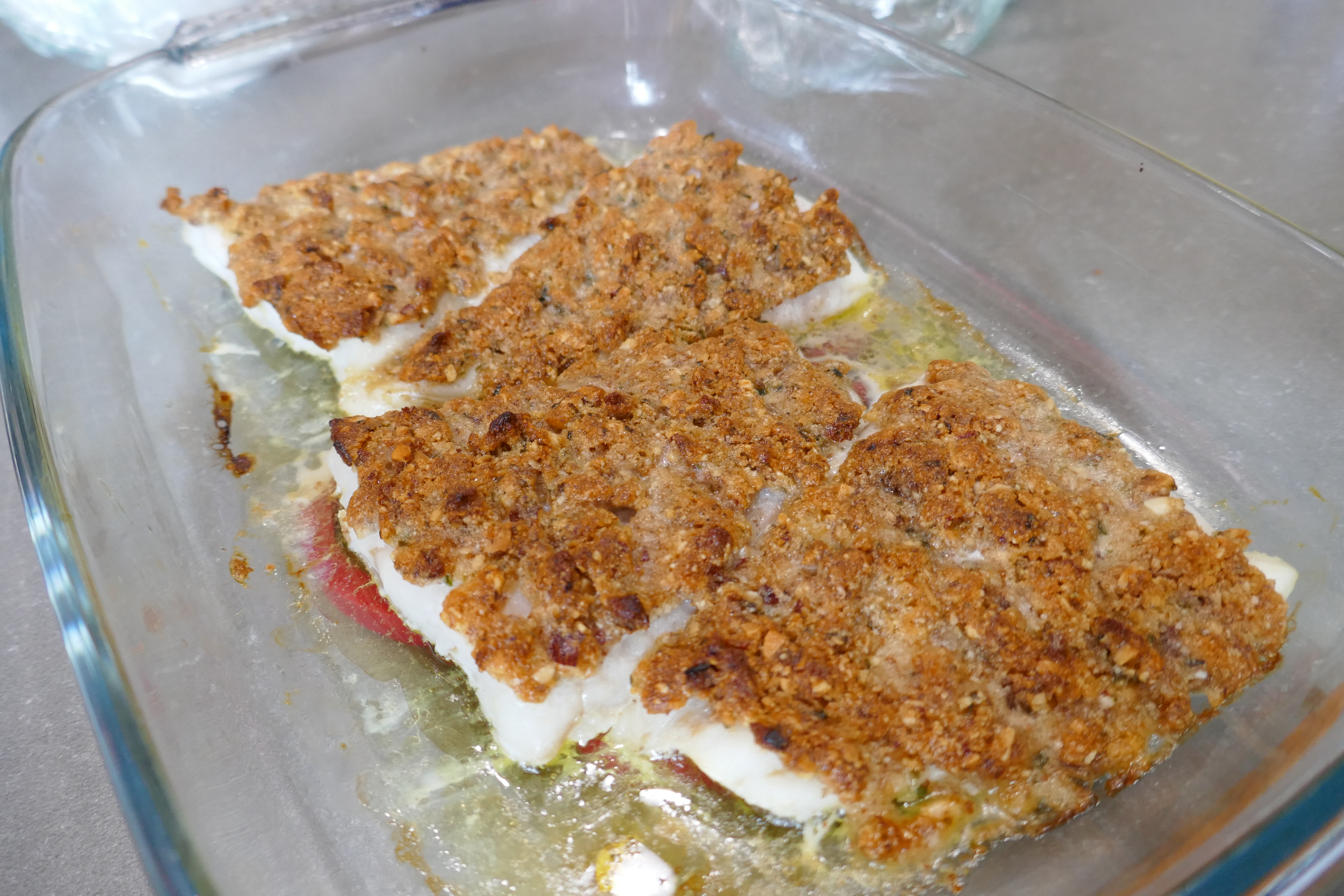- Disposer les filets de poisson dans un plat huilé et les recouvrir de la croûte, émiettée comme une pâte à crumble. Mettre un coup de moulin à poivre sur chaque poisson.