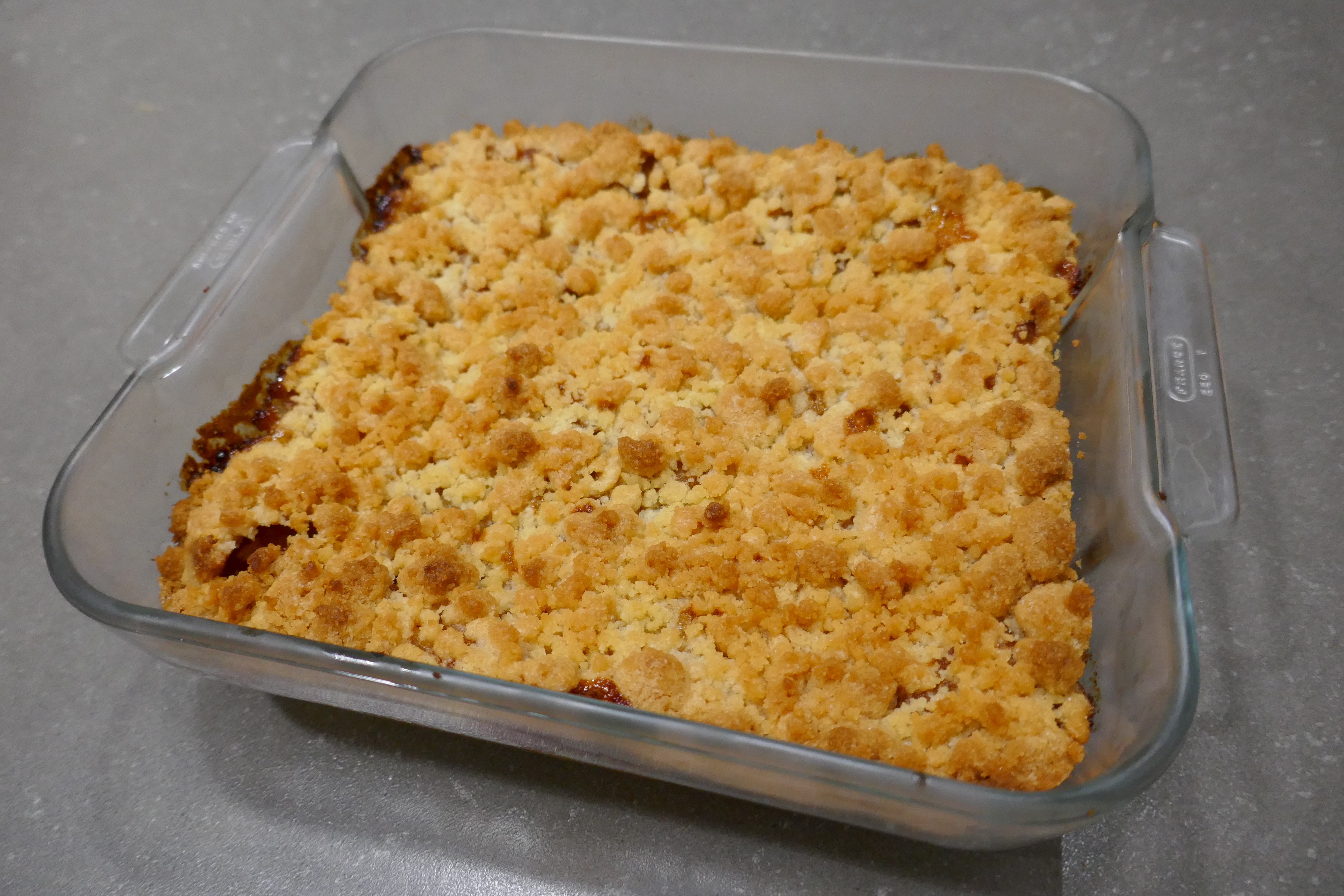 - Disposer les pommes au fond du moule et émietter grossièrement la pâte par dessus.