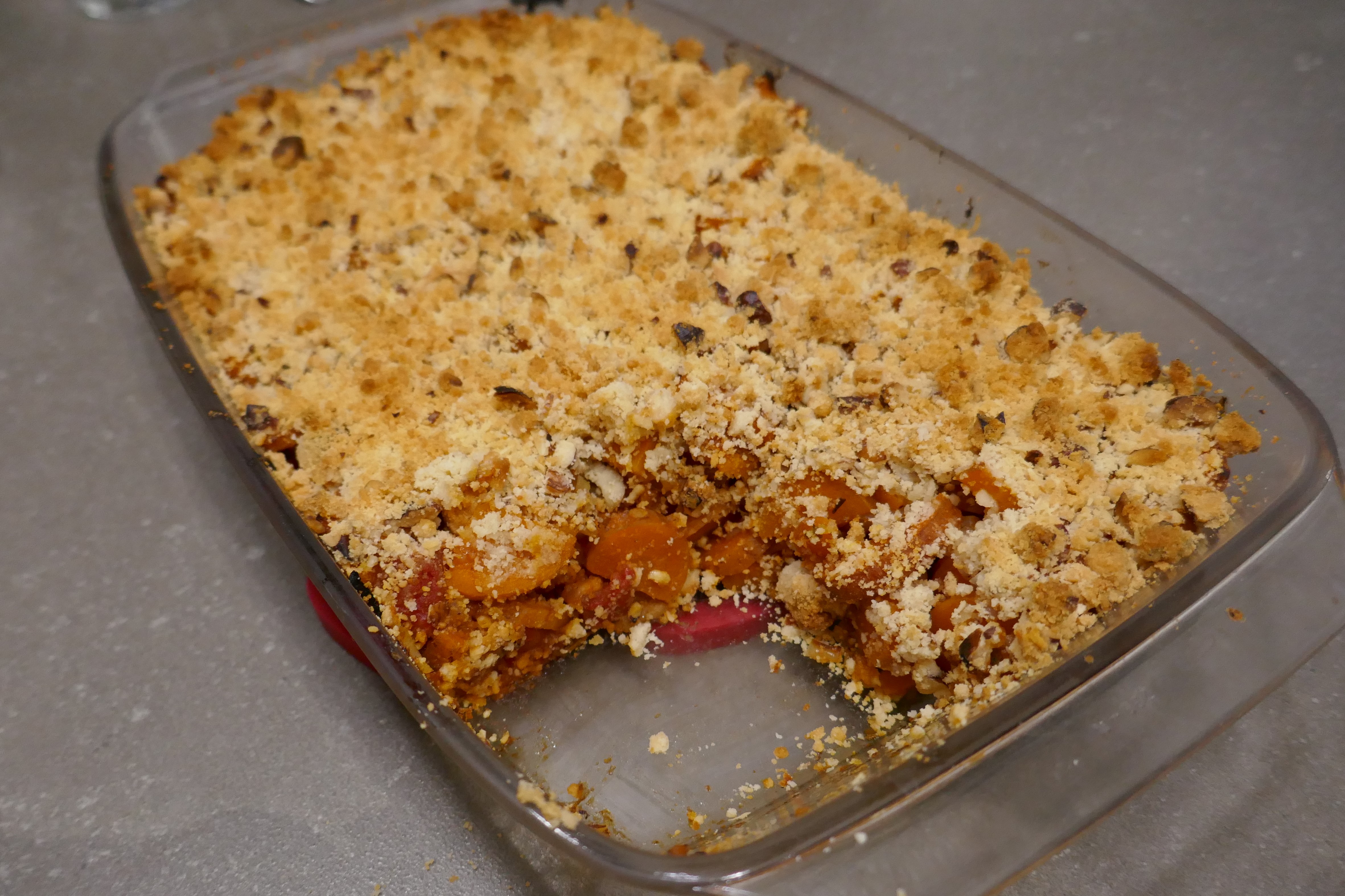 - Une fois que les carottes sont fondantes, mais qu'elles se tiennent, disposer les légumes dans un plat à gratin et parsemer la pâte à crumble sur le dessus.