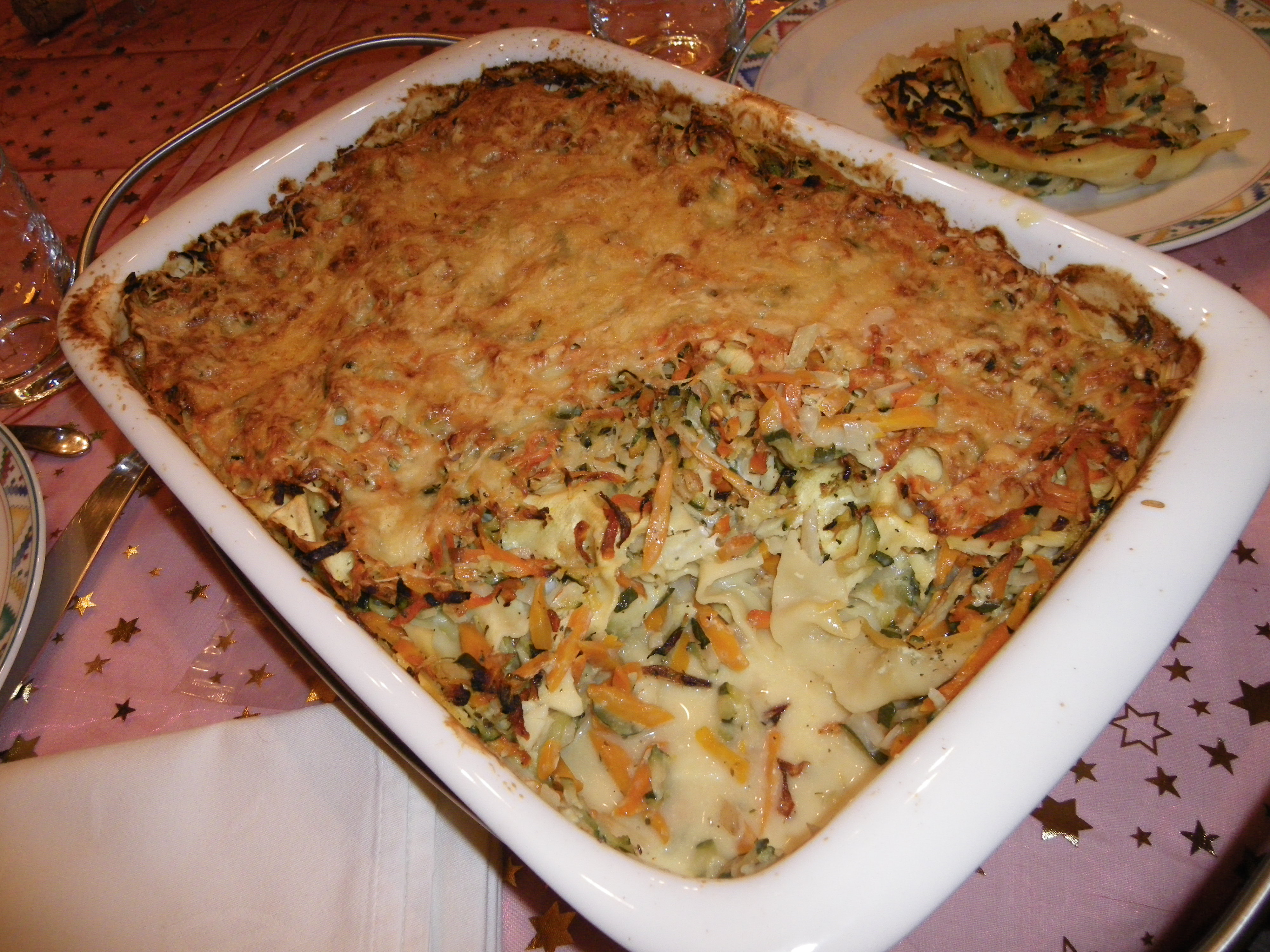 - Disposer dans un plat une couche de pâtes, puis une couche de légumes et alterner ainsi jusqu'à épuisement. Finir par une couche de légumes.