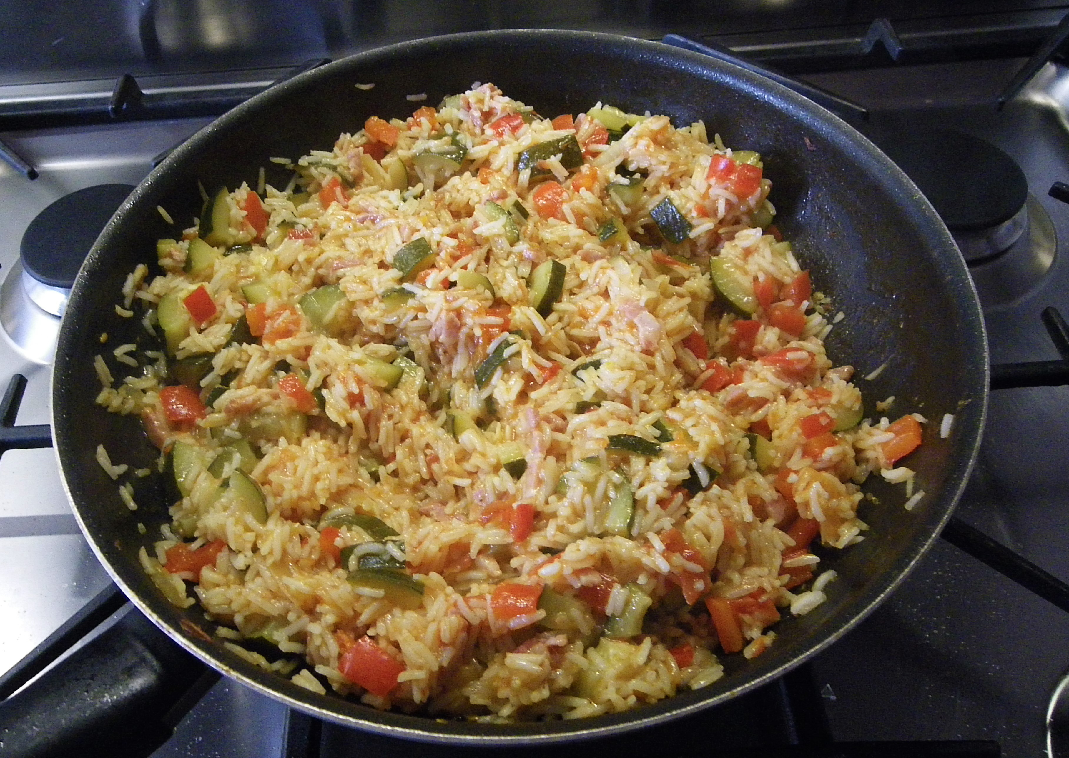 - Poivrer et laisser mijoter jusqu'à ce que le riz soit cuit (environ 15-20min). Vérifier régulièrement qu'il y a assez d'eau pour finir la cuisson du riz.
