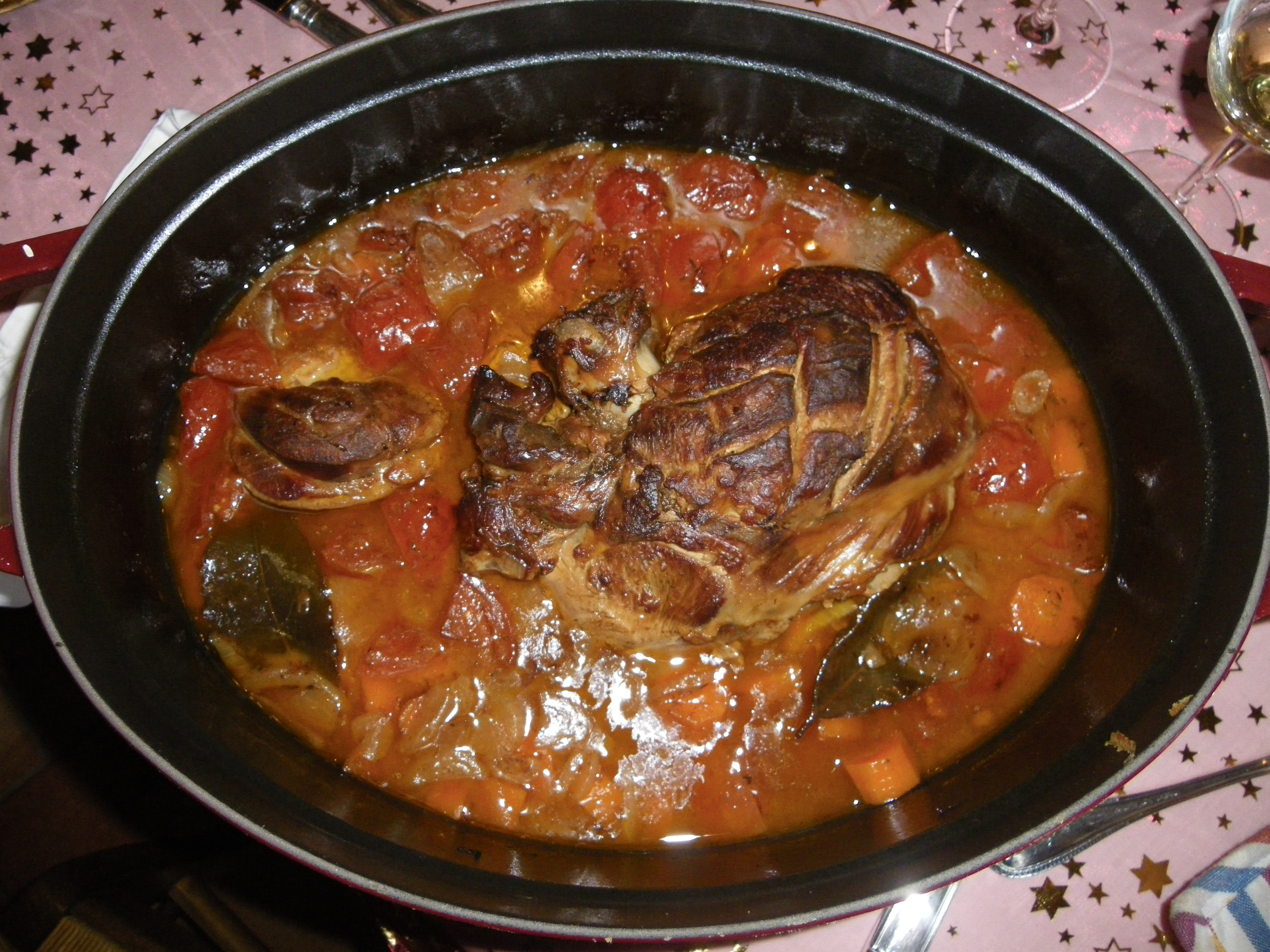- Ajouter enfin la préparation précédente et ajouter du fond de veau si besoin : le gigot doit être recouvert jusqu'à la moitié.